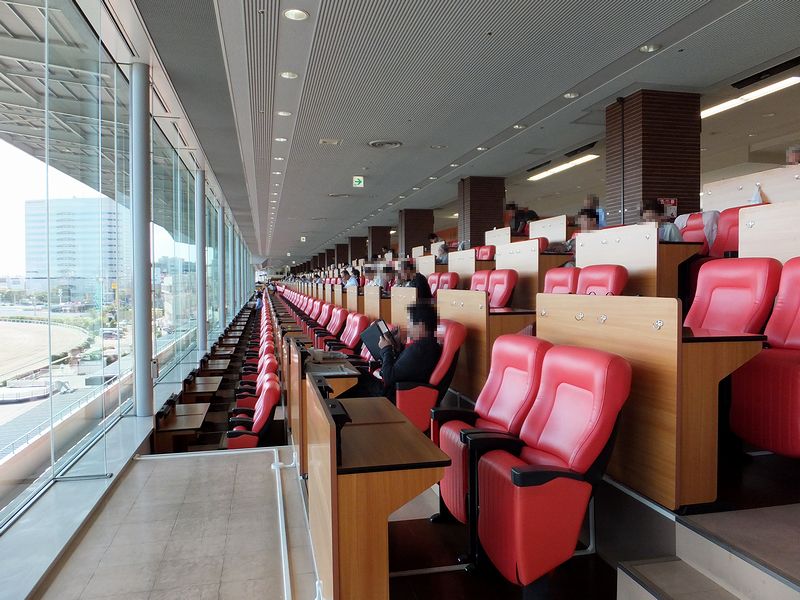 特別観覧席フロアは5,6年前にリニューアルされたそうで、まだまだ綺麗な状態でした。それで「この椅子、どこかで見覚えが…」と思っていたら、あとで以前行ったことがある新潟競馬場のA指定席と同じだと気が付いたのですが、座り心地は結構良いですよ。あと、ソフトドリンク(紙コップの自販機タイプ。)は無料です。また、フロア内には食堂もありましたが、個人的に特別観覧席の食堂って、競馬場に来るとあっちこっち買い食いするおかげで、なかなかいただく機会がないんですよね。(それが毎回勿体ないというか…。)