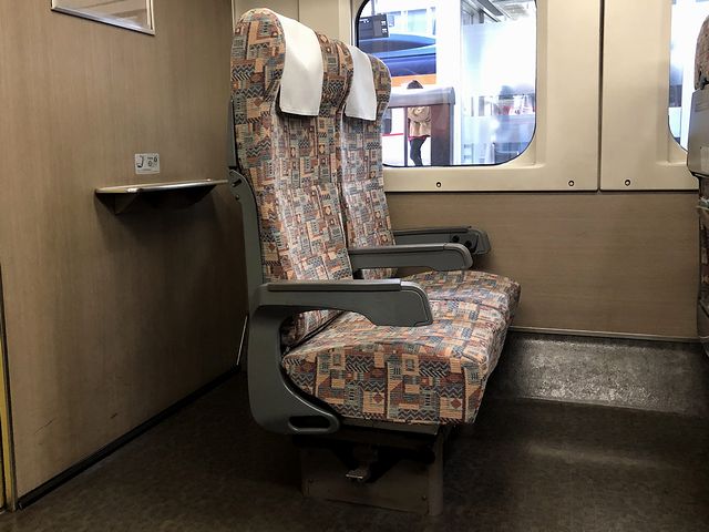 車内清掃が済んで8時ちょうどに乗車が開始されると、乗車列どおりには並んでおらず若干カオス状態でウェイウェイしている若者たちと共に車内へ。もっとも、その若者たちは2階席に行き、私はといえば、今回、事前に指定席特急券を購入しておいた車端部にある平屋部分へと。