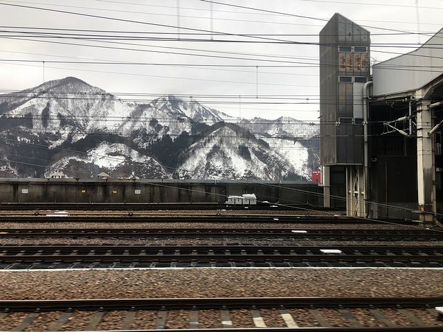 やがて、長い長いトンネルが終わると、先程までの冬晴れからは一転してどんよりとした曇り空が広がり、周りの山々が雪をいだく越後湯沢駅に停車。ガーラ湯沢行きの車両からもだいぶ降車がありました。またここで、後寄り8両を切り離しますが、ガーラ湯沢駅のホーム有効長が12両分しかないためらしいです。