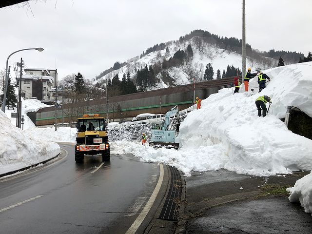 県道462号に出ると右に進み、先程乗ってきた線路をくぐると、重機やロータリー車を使った除雪作業中。歩道は雪に埋もれていましたが、交通誘導員さんの指示に従って通過。