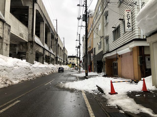 で、そのまま進む途中、近くにビルの屋上からドサっと雪の塊が落ちてきたのにはびっくり。どうやらビルの屋上に積もった雪を捨てているようで、そのビルの前の歩道はカラーコーンなどで歩けないように区切ってありましたが、まさか屋上から雪が落ちてくるとは思いませんでした。もっとも、当地では見慣れた光景らしく、かなり大きな音を立てて雪が落ちても、注意を払う人はいませんでしたが。