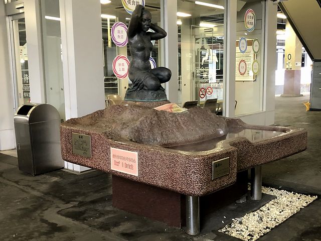 越後湯沢駅のホームに入ったところ、「湯浴み」と題したブロンズ像が鎮座。これは元々、「湯の町」湯沢の象徴として昭和27年(1952年)、下り線ホームの洗面台に設置(ちなみに当時の駅では、列車利用者の便を図るため、洗面台が当たり前のようにありました。)したもの。それが経年によって傷んでしまったため、平成9年(1997年)の北越急行ほくほく線開業に合わせ、修復そして台座を新製のうえ0・1番線ホームに移設したものだそうです。