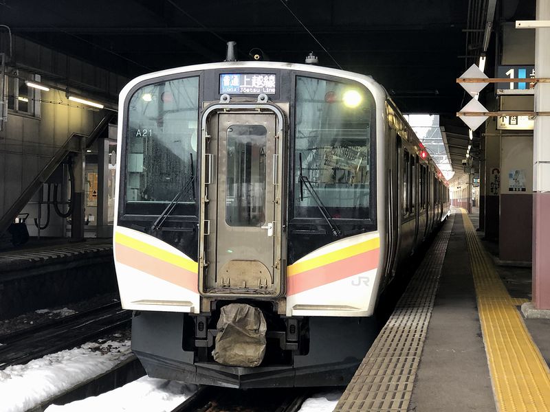 ほくほく線の列車は、快速や後述する超快速など、越後湯沢駅や直江津駅まで乗り入れる列車もあるのですが、普通列車はこの列車のように、律儀にほくほく線内だけを走るものもあるようで。