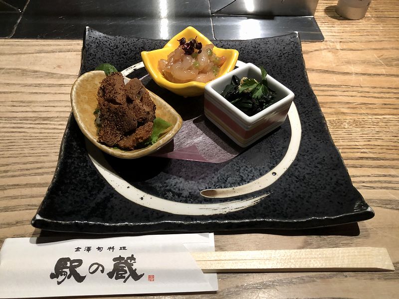 そしてつまみは、旅行者には有り難い金沢というか石川名物の3種盛り。左から、河豚の子糠漬け、甘海老の醤油麹漬け、金時草の酢の物です。