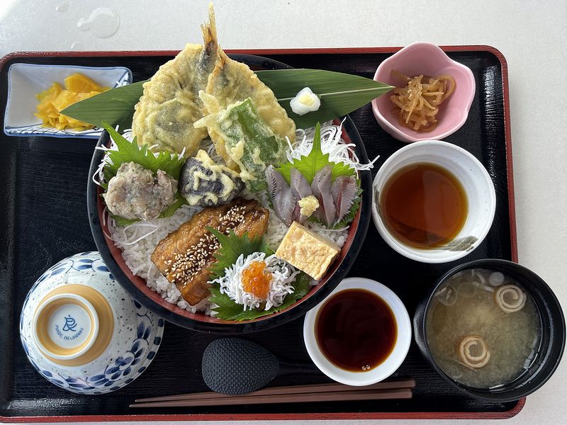 施設は1階が直売所といわし資料館、2階がフードコートになっていて、フードコートには3つのお店が入っているものの、この日はそのうち1つがお休み。なので残りの2つのお店のお品書きを見比べた結果、奥にあったこちらのお店で、いかにもな「いわし三昧」という品の食券を購入。秋なのに暑かったこの日、館内は冷房が効いていたのですが、換気の良さを求めてベランダにあるテラスでいただくことにしました。