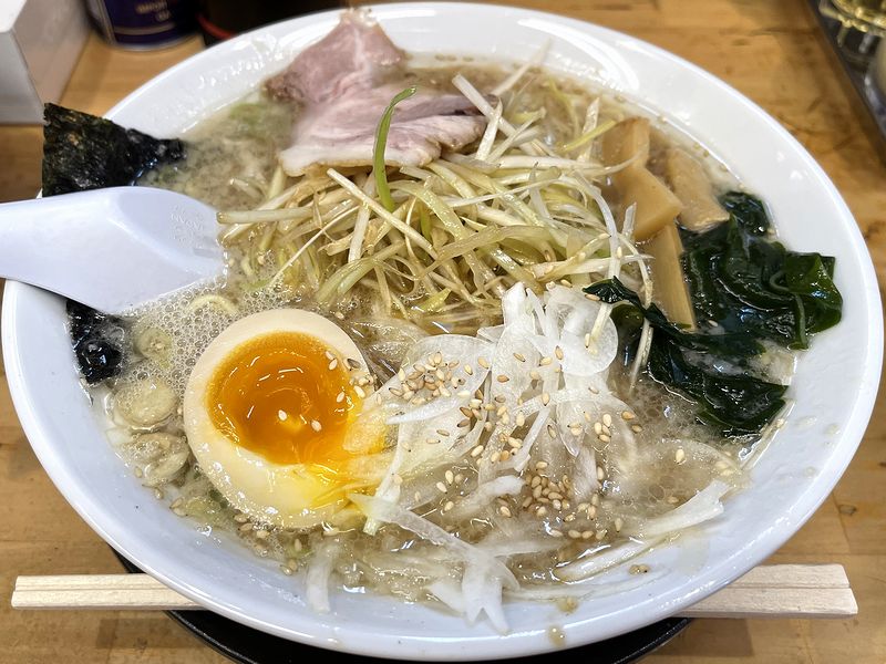 そして具は、タレで和えたネギの他、チャーシュー1枚、トロっとした半熟の味玉が半個分、海苔、メンマ、ワカメとオールスター状態ですが、そこに加わるスライスされた生タマネギが良い感じ。そのフレッシュ感とちょいと刺激のある風味が、このラーメンには良く合っています。
