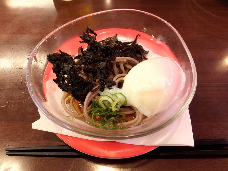 それがこちら。回転寿司チェーン店の中には、うどんやそばをメニューに加えているところも多いのですが、個人的にはこれまで『元気寿司』ではそのテのものを見かけた記憶が無かったというか。で、それが有ったものだから、つい手に取った次第で。してそのお味なのですが、回転寿司のレーンで回っている物に対して蕎麦の香りや食感がどうのこうの言うのは野暮というもの。168円でいただけることを考えれば、量的に一口サイズとはいえ半熟卵や岩のりも載っていて、目先を変える1皿として、また〆の一皿としては良いんじゃないでしょうか。