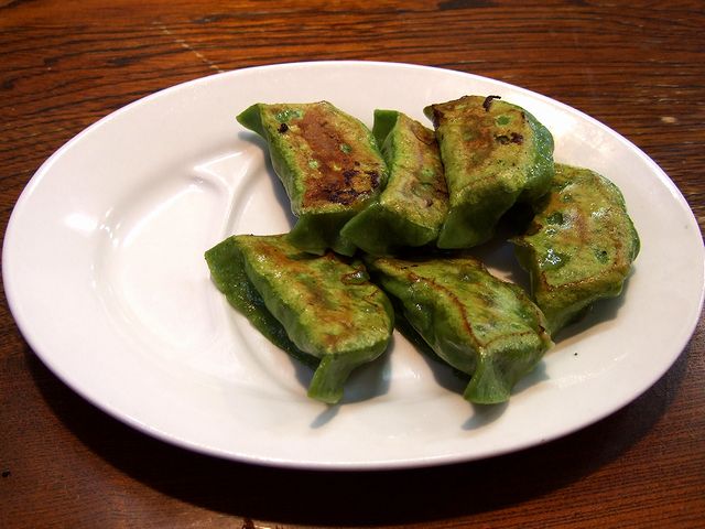 餃子 350円 餃子の皮の緑色は、ホウレン草を練り込んだものらしい。ニンニクが効いた餡はペースト状。