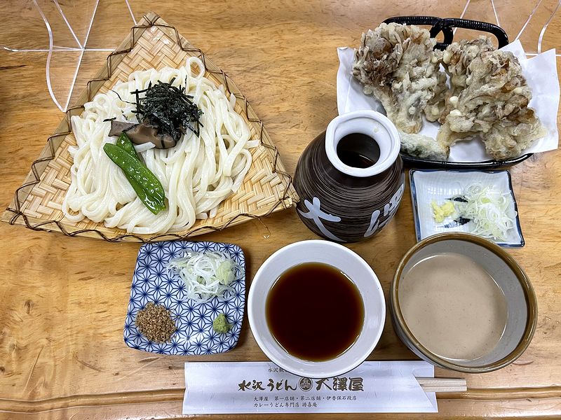 あと、水沢うどんといったら付き物の舞茸の天ぷらは、表面サクっとクリスピーで、先端部の薄いところは香ばしく、芯に近い方はホクホクジューシー。衣に薄く塩味が付いているのでそのまま召し上がれますとのことでしたが、その塩加減が丁度良く、そのままいただけば香ばしさを堪能でき、またうどんつゆを付けてもしょっぱくなり過ぎない塩梅が良かったです。
