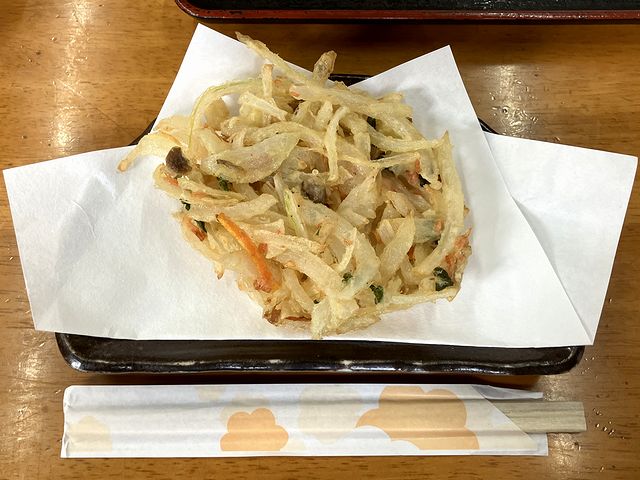 またかき揚げは、タマネギ、ニンジンの他にもいくつかのタネが入っていましたが、全体的に薄衣でサっクサクの食感が、また。