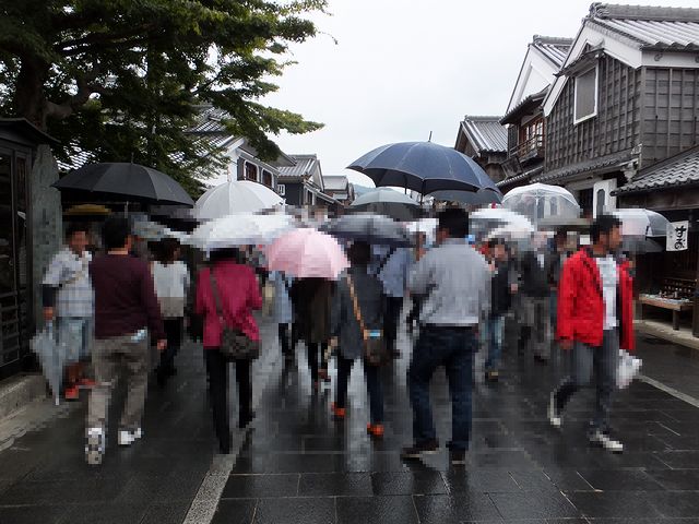 そこから伊勢市内を走って伊勢神宮を目指すのですが、道路の両側から絶え間ない赤福コールが。それにしても、さすがに式年遷宮年の土曜日。天気が悪いにもかかわらず市内の交通量はわりと多めで、それがさらに増えてくると伊勢神宮に近づいたことがわかります。