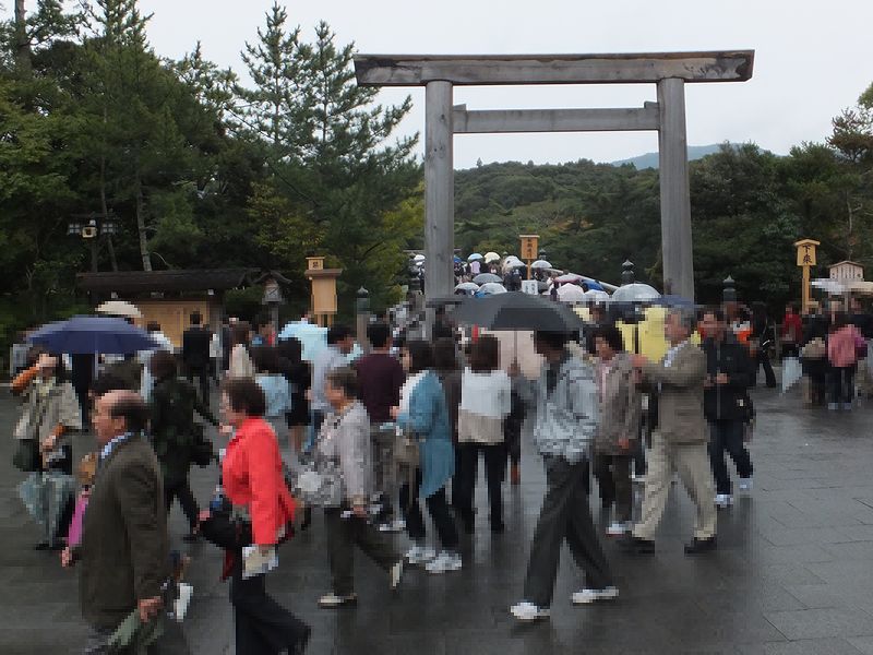 いただく物をいただいたら、あとはお参りするだけなのですが、内宮に至るまでの参道が、これまた激混み。おかげ横町から参道を抜けるのにたかだか2、300mの筈なのですが、やたらと時間がかかりました。で、その間、何度傘が顔や首筋に当たったことか!(個人的には、雨もだいぶ小降りなんだから、傘さすのやめれば良いのにと思うのですが…。)仕方がないとはいえ、別の意味でテンション上がってしまいます。せっかくお参りに来たのだから、心静かにいきたいんですがね。