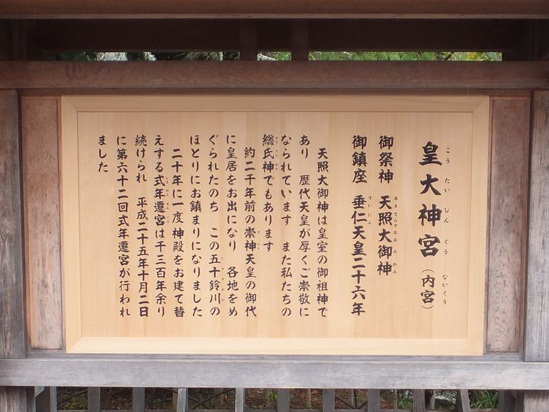 それでその伊勢神宮。その歴史は大変に古いというか、日本書紀によると第11代垂仁天皇の皇女である倭姫命(やまとひめのみこと)が天照皇大神のご神慮を受け垂仁天皇26年に創建。ちなみ日本書紀や古事記の天皇在位年を無理矢理西暦に変換したものによれば、紀元前6年になるのでしょうか?もっとも、今の世の中、日本書紀は歴史書と見なされていないので、このあたりは伝説の範疇に入ってしまうということで。そしてその後、第21代雄略天皇22年(これも前述のとおり西暦変換すると478年)に天照皇大神のお告げによって豊受大御神を迎えて祀られるようになりました。また、飛鳥時代の天武天皇14年(685年)に式年遷宮が定められ、持統天皇4年(690年)に第1回の遷宮が行われました。