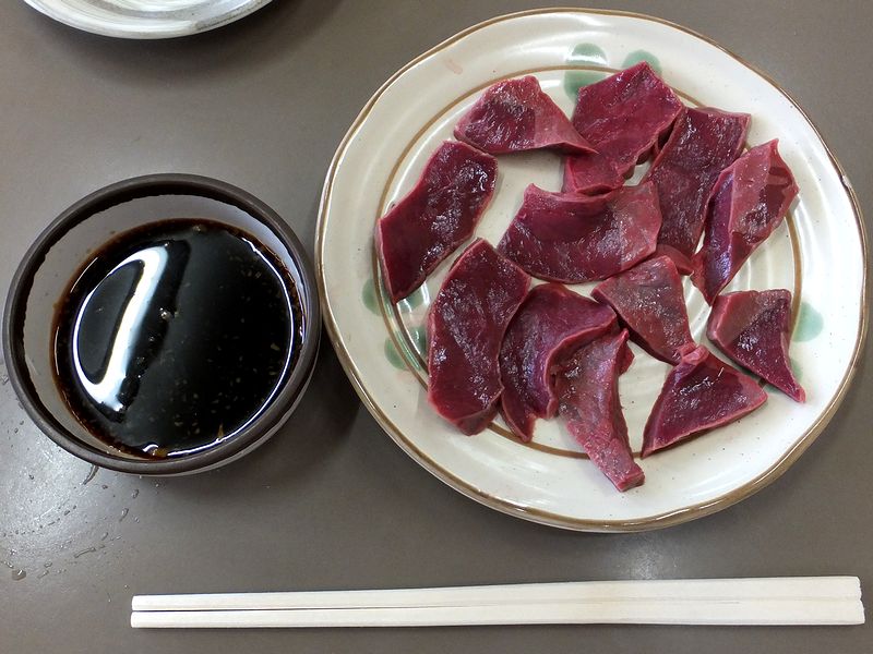 まずは軽くジャブ的にこちらを。生姜醤油っぽいタレでいただくのですが、クセは全く無く、お肉の新鮮さが良く判ります。お酒のアテにぴったりですね。