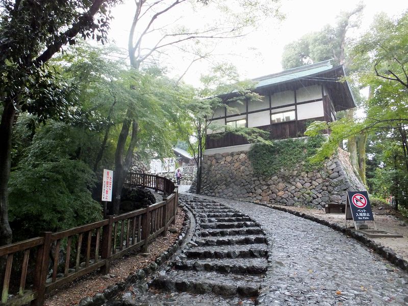 登城道は左右に曲がりながら高度を上げていきます。ところで、正面の建物の基部が櫓台っぽいのですがどうなんでしょ?それと奥は針綱神社で、濃尾の総鎮守だそう。延長5年(927年)の延喜式にも記述のある式内社で、もともとは犬山城天守付近に鎮座していたのですが、その後数度の移転を経て明治15年(1882年)に現在の位置になったそうです。また、織田信康公が手彫りの狛犬一対を奉納したことから、安産の安産・子授けに御利益があるそうで。