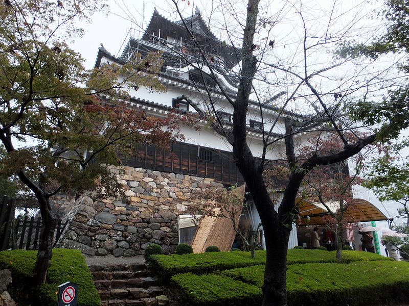 入場券を購入して、いざ本丸へ。それで、現存天守とご対面なのですが、なんということでしょう。修繕中なので足場が組んであるのは仕方がないにせよ、犬山城天守の特徴である付櫓が、シートに隠れて見えないなんて。