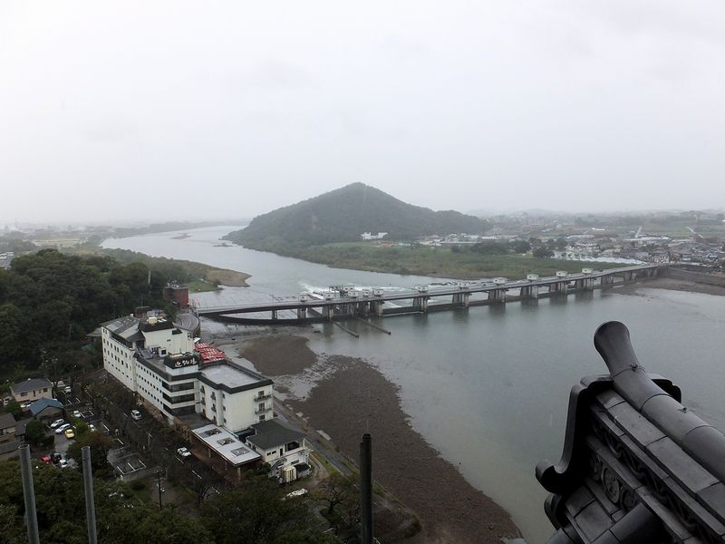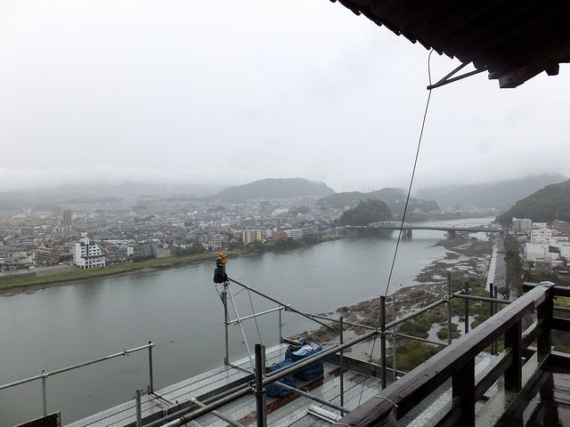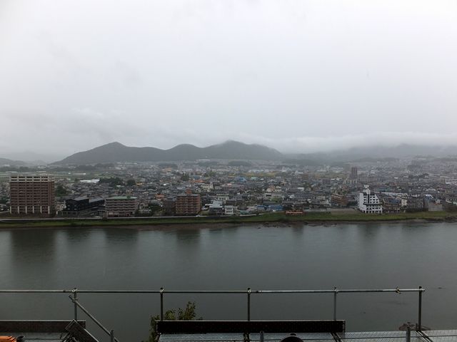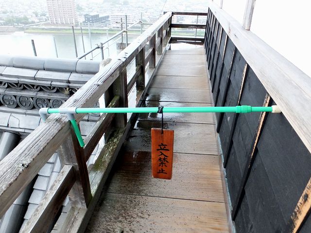 天守最上部の回廊からは、下を流れる木曽川などの眺めが堪能できます。天気が良い日は名古屋城も見られるらしいのですが…。ちなみにこの日は、悪天候のため回廊の立入が一部制限されていました。