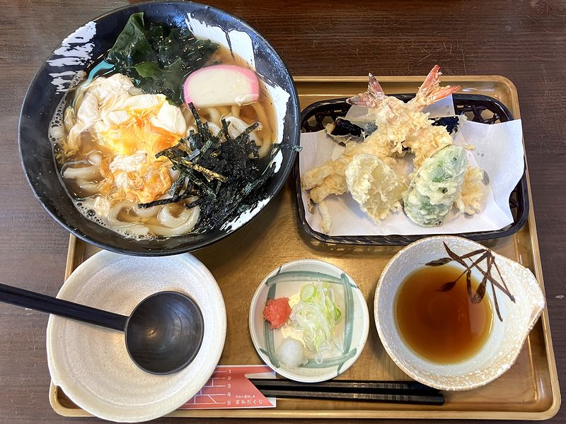それで今回、私がいただいたのは、この天とじうどん。個人的に「天とじ」と言えば、海老天などの天ぷらが、あらかじめツユの中で卵とじにされた状態を想像するのですが、こちらのお店のは、天ぷらが揚げたてのを別盛りにして、更に玉子は少々崩しただけで固まっている状態。もっとも、お店のウェブサイトには写真付きでメニュー紹介があるので、こう来るのは知っていましたが。