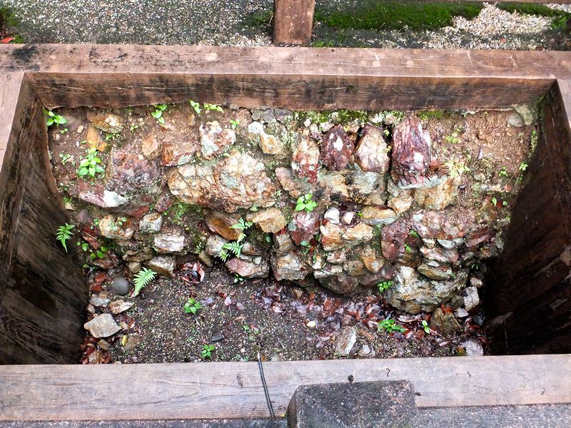 本当は資料館内の展示物や天守内も観たかったのですが、次の予定が気になったので断念(前回に続いて今回も観なかったというか…。)し、急いで山を下りることに。それでその途中にあったのがこの井戸跡。湧き水が無い稲葉山では、雨水と岩の間から僅かに染み出る水を集めるためのものを井戸と称したそうで、二ノ丸の両脇に4箇所あったとのこと。
