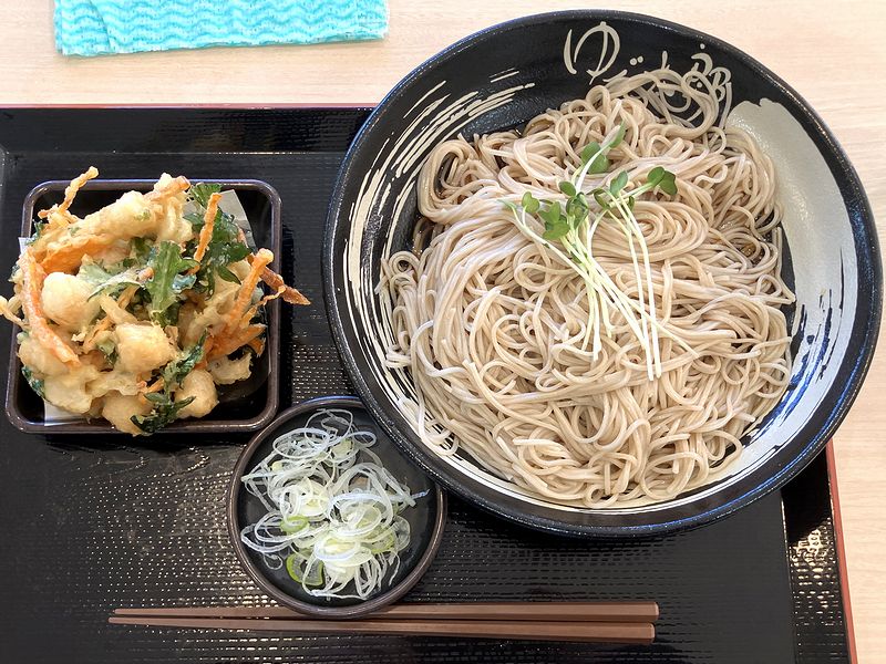 【小柱と春菊のかきあげそば(冷) 800円 + そば大盛 100円】