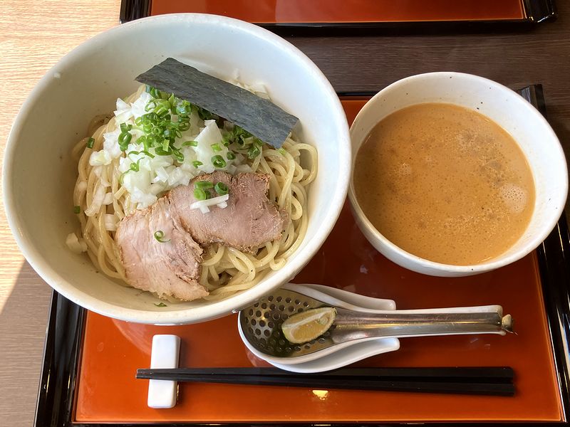 そして次に、その麺をつけ汁にくぐらせてからいってみると、「なるほど、そうきたか」と。つけ汁にくぐらせることによって煮干分が適度に落とされるのか、魚魚した風味は落ち着いて、変わって胡麻の香ばしさやまろやかさが加わって。加えてベースの出汁は結構濃いめの動物系でしょうか?その旨味やコクも感じられるような。ちなみにつけ汁は、担々麺の辛み抜きのような塩梅で、挽肉もわりと入っていました。(動物系の旨味はこの所為もありますかね?)