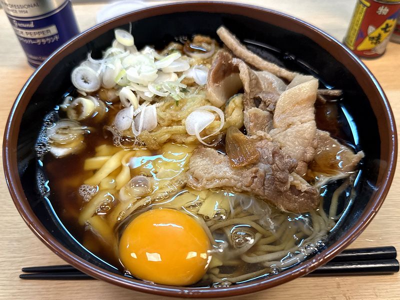 それから程なくして、「チーズが入っているから、合うのでよかったら使ってください」と、コショウのボトルと共に登場したのが、今回いただくチートロスペシャルそば。なんでもこちらのお店は、チーズと生卵が入った「チートロ」という品が有名だそうですが、どうせならスペシャルな方を、ということで。ちなみに、チートロ(チーズ+生卵)に加え、かき揚げと豚肉が入っている豪華版となります。