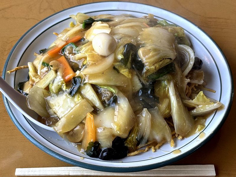 また餡は、トロミが程よく、味付けは醤油がベースだろうか。甘味は控えめで、どちらかというとあっさり。それよりも具が特徴的で、白菜、ニンジン、玉ネギ、キクラゲ、ウズラの卵などといった一般的な具材に加え、ワカメと水煮のマッシュルームが珍しい。ちなみに野菜の火の通し加減は、シャキッとした歯応えが強めの仕上がりに感じた。