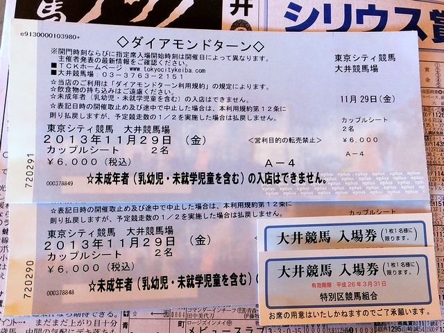 そんなダイヤモンドターンなのですが、たまたま相方とその話をしていたら、これまで南関4場に行くことに何故か乗り気でなかった相方から「行っみたい」とのお言葉が。(って、リアルではこんな口調じゃないんですがね。)で、たまたま(この時点では)今年の大井競馬トゥインクルナイターの最終日だった11月29日(金)は、午前中に所用がある関係で休日出勤の代休を取る予定だったということもあり、チャンスとばかりに速攻でチケットを申し込み。ちなみに、2名様用の席はテーブル席(席料と料理代金含めて1人当たり5000円)とカップルシート(席料と料理代金にウェルカムドリンクが付いて1人当たり6000円)があるのですが、折角なので今回は(少々気恥ずかしいですが)カップルシートのチケットを購入しました。それにしても、大井競馬場は指定席がe+で買えるので便利ですね。