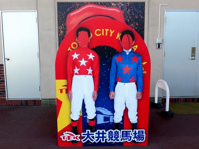 入場すると、まずはハイセイコー像へ挨拶。そしてダイヤモンドターンのある4号スタンドへ真っ直ぐ向かったのですが、その途中にあった大井競馬場の顔出し看板は、的場文男ジョッキーと、現在はJRAに移籍した戸崎圭太ジョッキーでした。