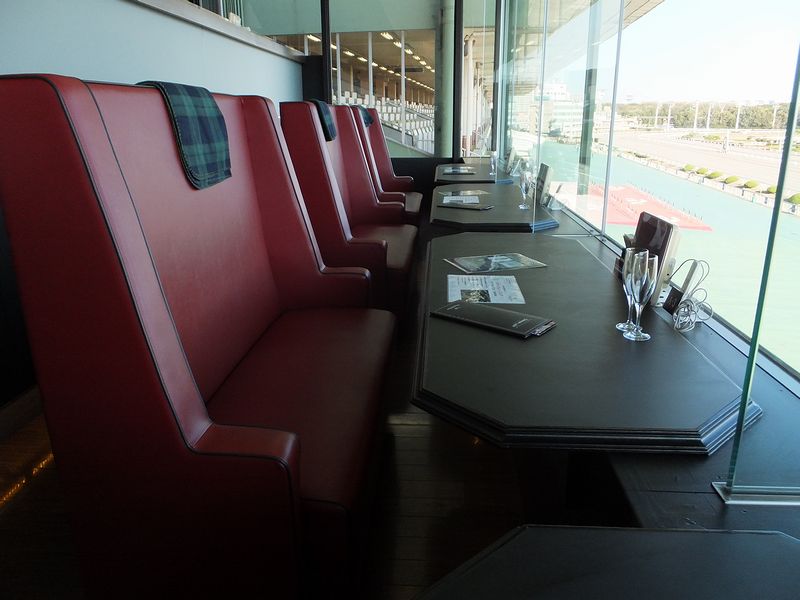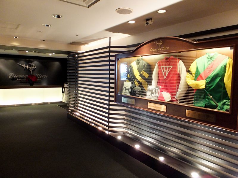そして、いよいよダイヤモンドターンへ。エレベーターで4階に上がると、エントランス付近の壁に掛けられた勝負服など、その気にさせる演出が既に始まっているというか、否応なしにテンションが上がってきます。そして従業員の方に恭しく迎えられ入場。そして席までは案内してくれました。