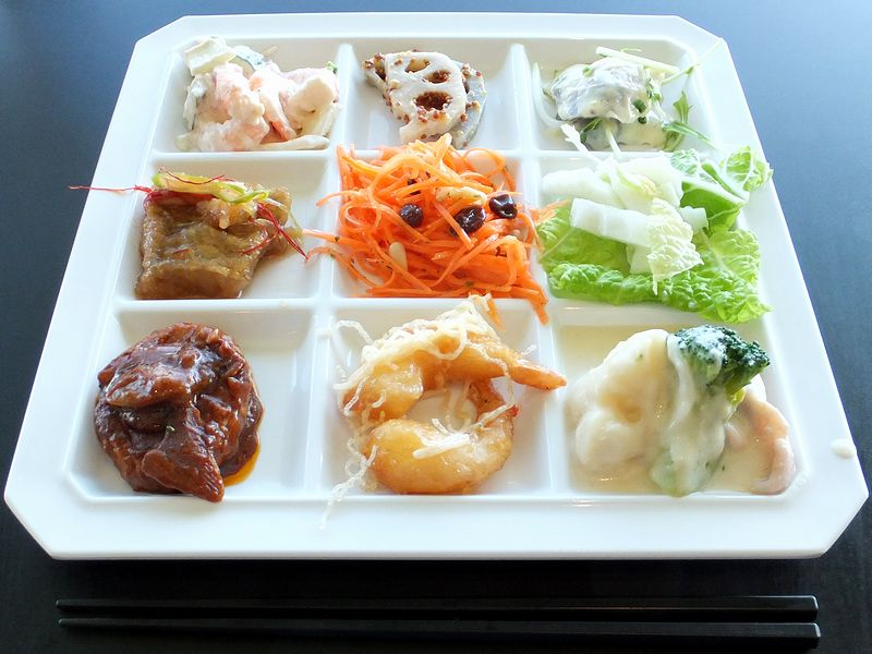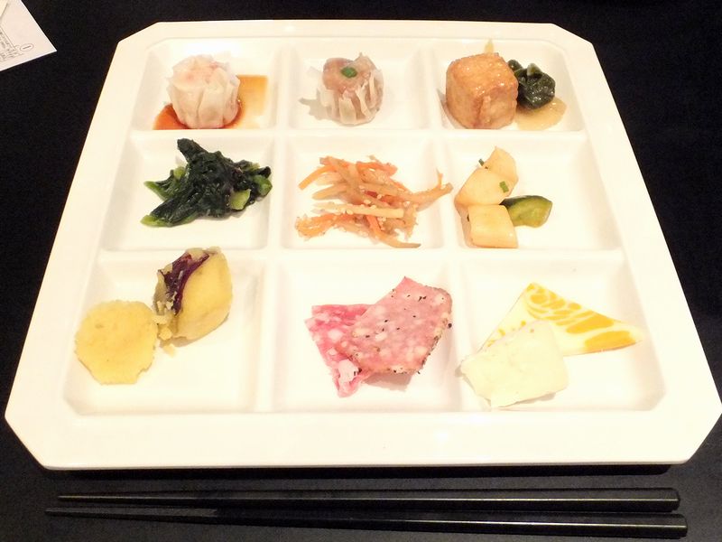 【上段左より「点心(シュウマイ)」、「点心(シュウマイ)」、「白菜とあつあげの煮びたし」。中段左より「青菜のおひたし」、「きんぴらごぼう」、「大根とキュウリのキムチ」。下段左より「サツマイモのレモン風味(サラダバー)」、「コールミートの盛り合わせ」、「チーズの盛り合わせ」】