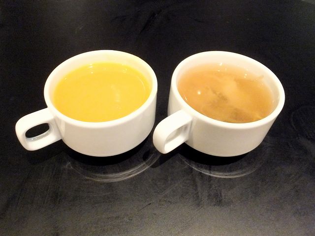 それでこちらが、今回座ったカップルシート。なんていうか、ソファー的座り心地でした。また、(レストランなので当たり前ですが)大きなテーブルと、結構大きめの液晶モニターが。それで席に落ち着くと、ウェルカムドリンクのスパークリングワインがサーブされます。もっとも、相方はアルコールが一切駄目なので、私が2杯いただくのですが。