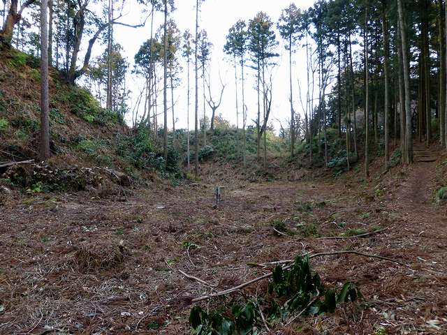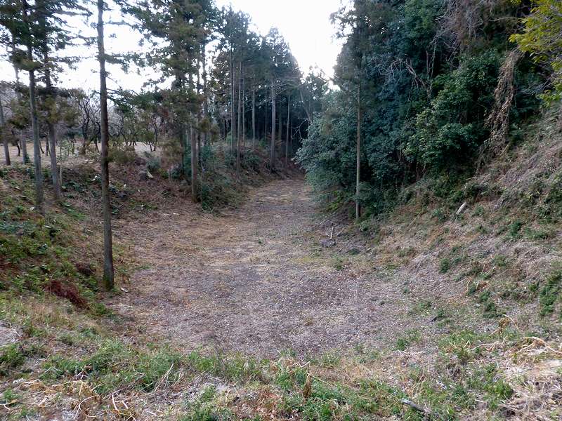 で、その駐車場にクルマを停め、降りたところ、いきなり大堀切がドドンと。写真だとスケール感伝わらないのですが、その迫力にかなり圧倒されます。