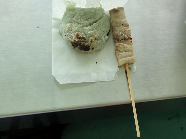 同行者が頼んだもちはは、うっすら緑色(草餅でしょうか?)で、中にあんこが入っていました。私が頼んだブタバラは、ごく薄味。下ごしらえで火が通してあったようなのですが、それでも結構な脂が染み出ます。で、両方とも、これまで焼き網に付いてきた様々な食材の風味がそこはかとなく漂って…。個人的には、焼くのは風味の強い食材が良いように感じました。でも、こういうお店好きなんだよなぁ。