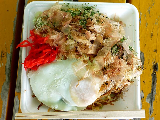 目玉ペアは、お好み焼きと焼きそばに目玉焼きが載ったボリューミーな一品で、これだけでお腹が一杯になります。また、たこ焼きにいたっては12コで300円と、某○だこの倍も入ってこのお値段!