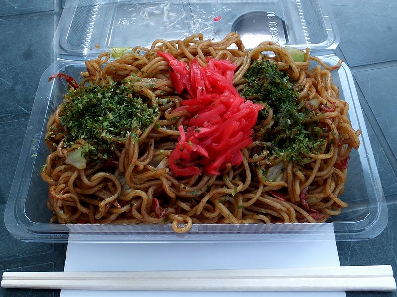 豪快に容器に盛られた焼きそばは、かなりの重量。ちなみに、紅ショウガと青のりはかけ放題なのですが、(特に紅ショウガは)山盛りにする人多数という感じで。それでお味の方ですが、これが独特というか、ソース味なのですが、ピリピリっと決して弱くない辛味が効いています。また、具はキャベツと桜エビなのですが、この桜エビが実に良い感じというか。これはビールが欲しくなる味ですねぇ。