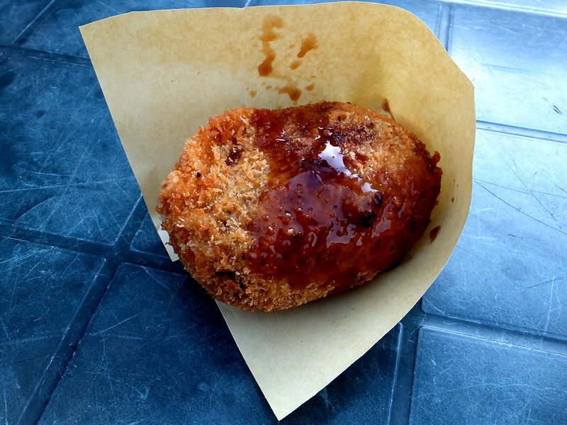 こちらも有名なお店というか食べ物その2。ちなみにコロッケ売店といっても、他にチキンフライ(250円)やあぐーメンチカツ(200円)に、ソフト、ハードドリンク各種も置いてありますが、やはり一番人気はこちら。(まぁ、お店の名前も「コロッケ売店」ですし。)