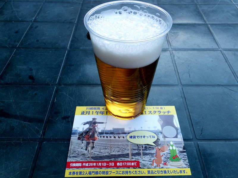 それで我慢できずにいってしまった生ビール。ちなみにお値段は(競馬場の中では)大井と並んでお高いのですが、この日は三が日限定のスクラッチキャンペーンをやっていて、その結果景品で蹄鉄をいただきました。