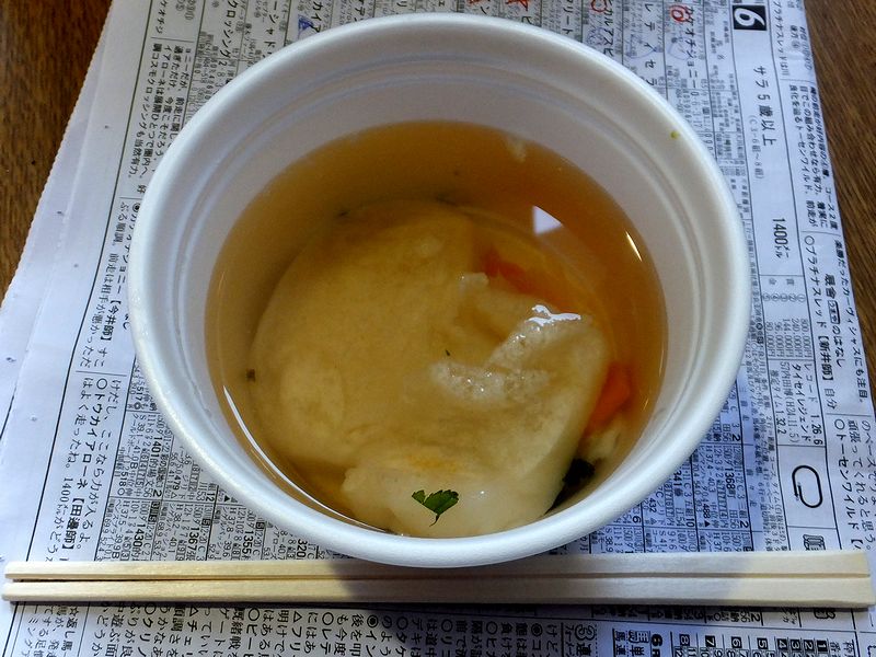 ですが今回は、迎春特別メニューのこちらを同行者が。それで一口味見させて貰いましたが、つゆは関東っぽい濃い口醤油が効いたものではなく、あっさりしてお上品な味付け。また具は、お餅(2個)の下に三つ葉と人参などが入っていました。