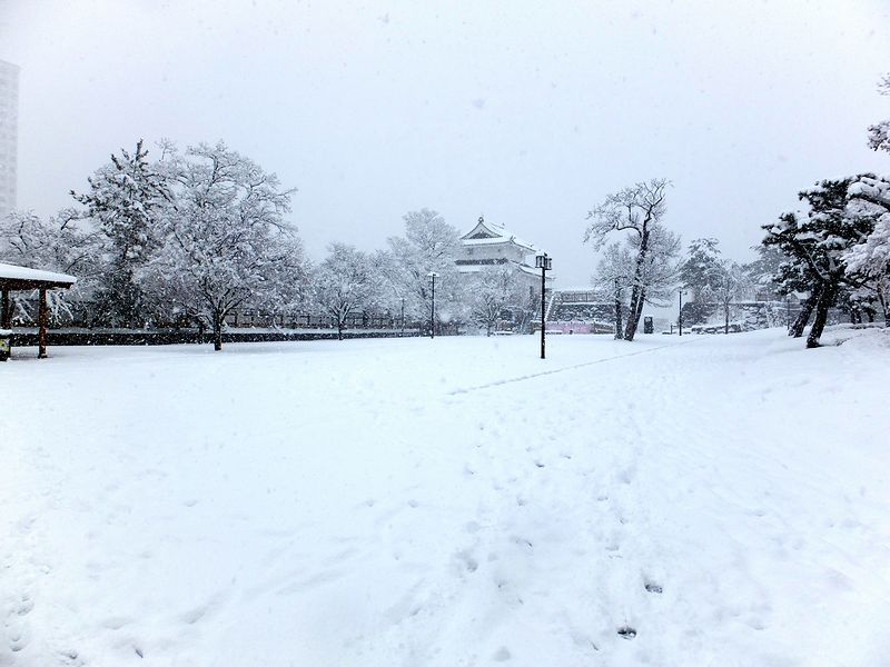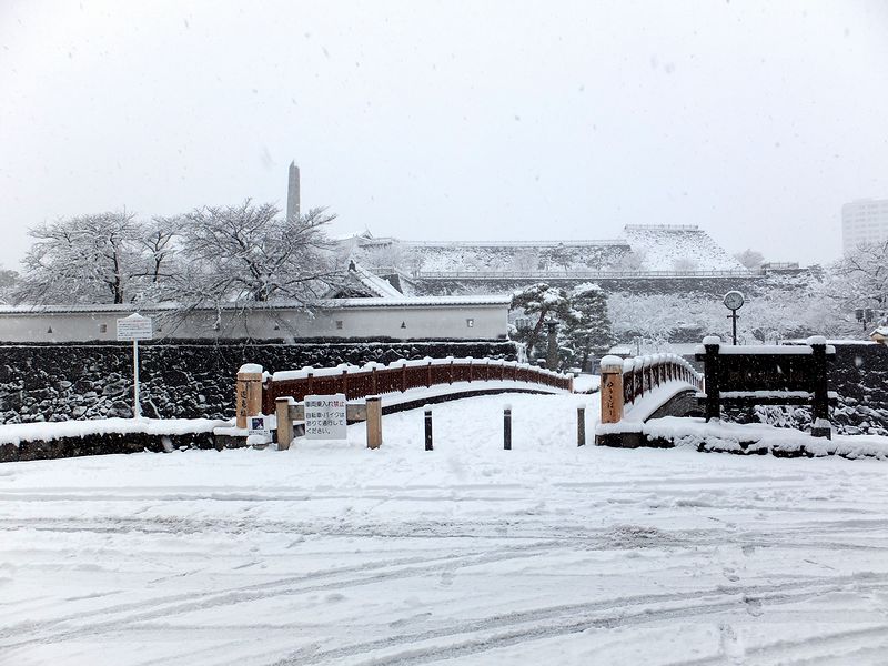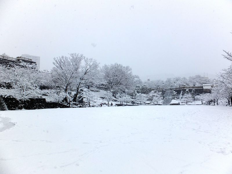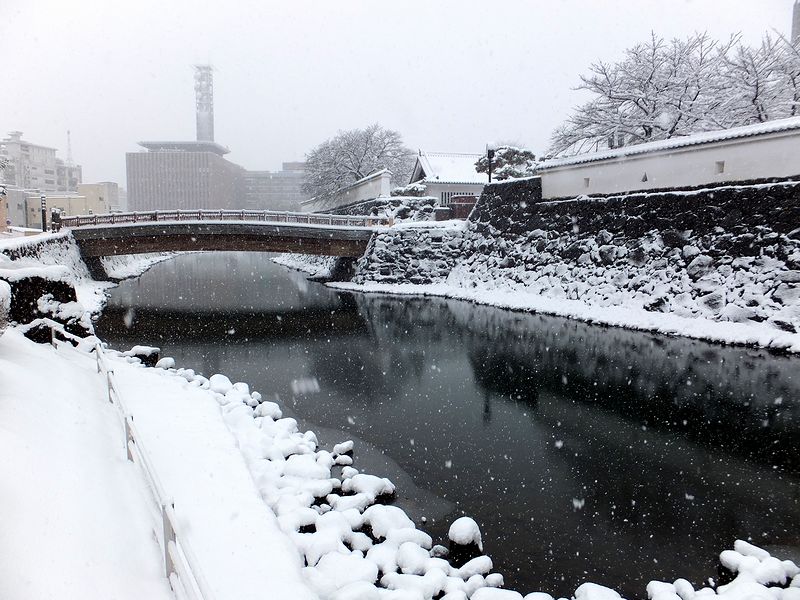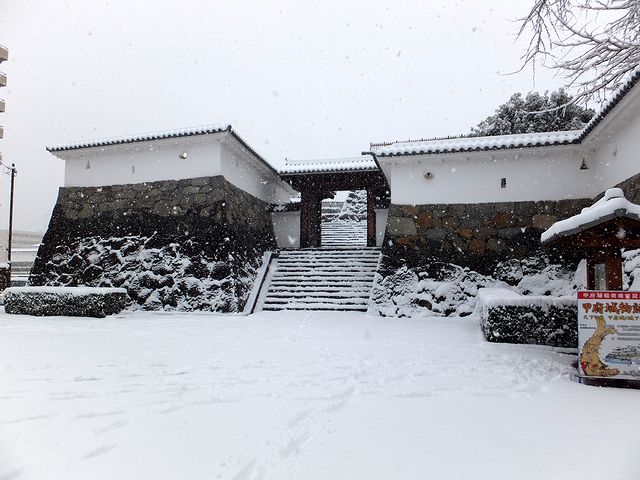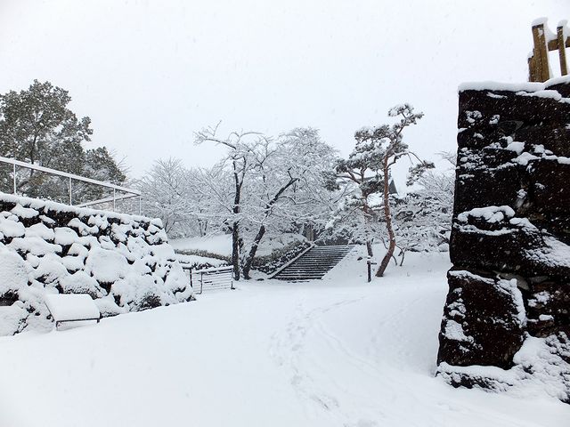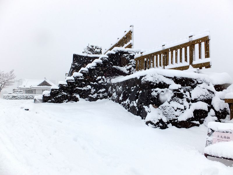 現在の城跡というか、舞鶴城公園のいちばん北側から東側にかけてあるのが、この稲荷曲輪。雪の降り続く中、ここまで見てまわると、さすがにしんどくなってきたというか。