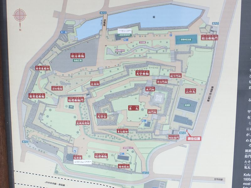 やがて幕末に入り、慶応2年(1866年)には勤番制を廃止し城代が設置されますが、翌年に大政奉還によって江戸幕府は消滅。明治維新では、板垣退助ら率いる新政府軍が無血入城し、鎮撫府が置かれました。そして明治6年(1873年)に廃城になって以降、残っていた建物が失われ、替わりに城跡は、葡萄農場と葡萄酒醸造所が造られ、中央線と甲府停車場(現在のJR甲府駅)が設置され、学校や県庁敷地となりましたが、残った部分は明治37年(1904年)から(一部を)舞鶴城公園として市民に開放されました。やがて昭和に入り、城域の西側部分が市街化されたりしたのですが、昭和43年(1968年)、山梨県の史跡に指定され、平成2年(1990年)からは公園整備事業に着手。発掘調査が行われたり、平成16年(2004年)には稲荷櫓が復元されるなどした他、現在も石垣の修復作業が続いています。