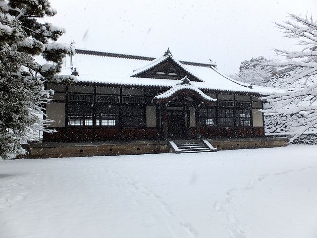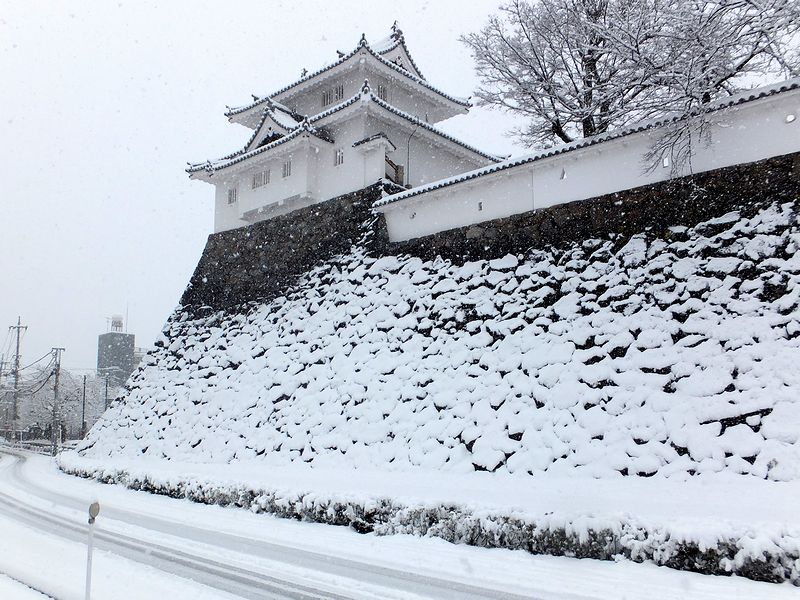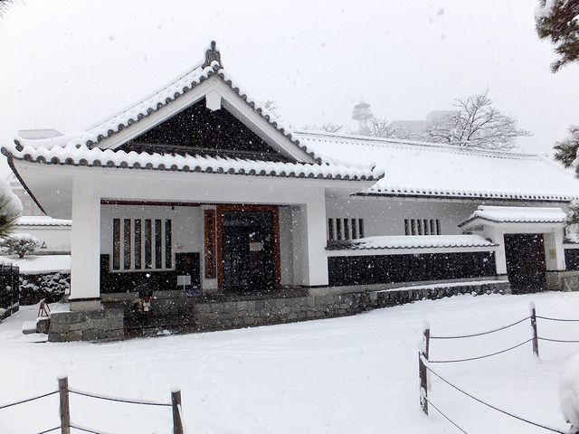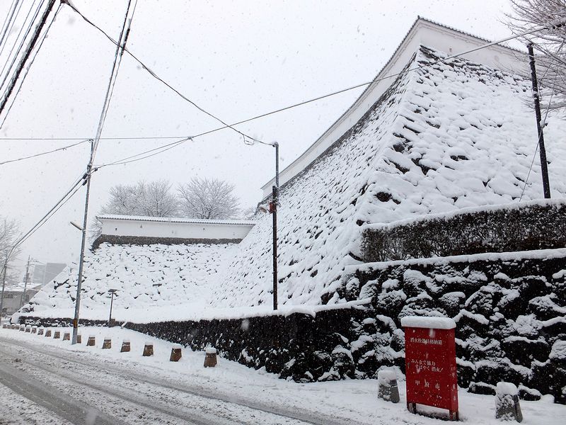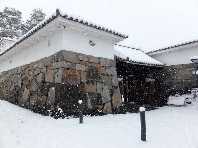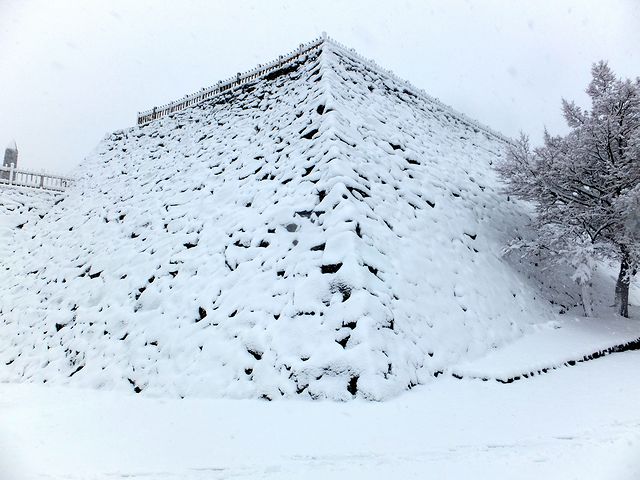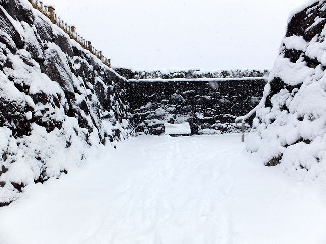 そんなわけで、復元された稲荷櫓や高さ約17mという高石垣を眺めつつ正面入口まで歩いたのですが、雪のお陰で穴太積みの石垣が十分に堪能できないというか。また、雪がスケール感を狂わせるのか、大きさ的感動も…。と、ネガティブに書いたのですが、実は個人的に、それを補って余りあるのが雪化粧の魅力。雪は七難隠すというか、何でも美しく見せますね。それにしても降り方が、ちょっと強すぎな気もしますが。