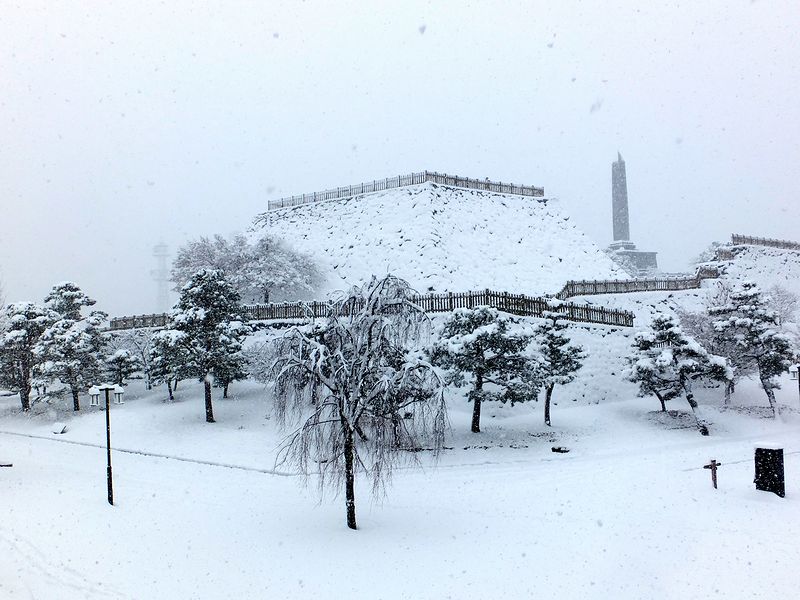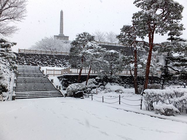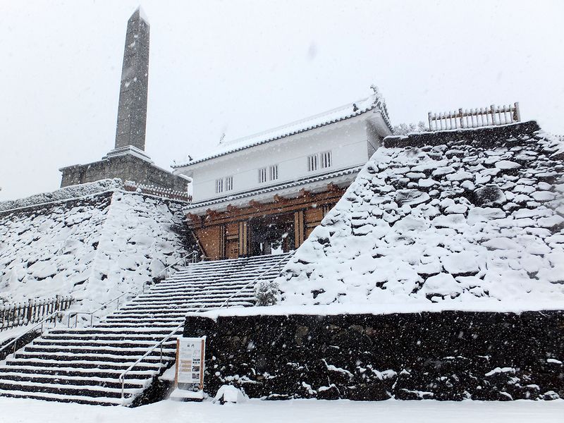 鍛冶曲輪からその上の本丸へは階段になっているのですが、それを上ったところにかつてあったのが坂下門で、その付近の石垣の積み方が違うことから、積んだ時代が(築城時とは)違うと考えられているものの、雪のお陰でよくわからないというか。あと、写真奥に聳え立っているのが恩謝碑で、明治44年(1911年)に御料林が下賜されたのを記念して、大正11年(1922年)に建立されたもので、高さは30mもあるそうです。