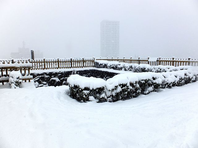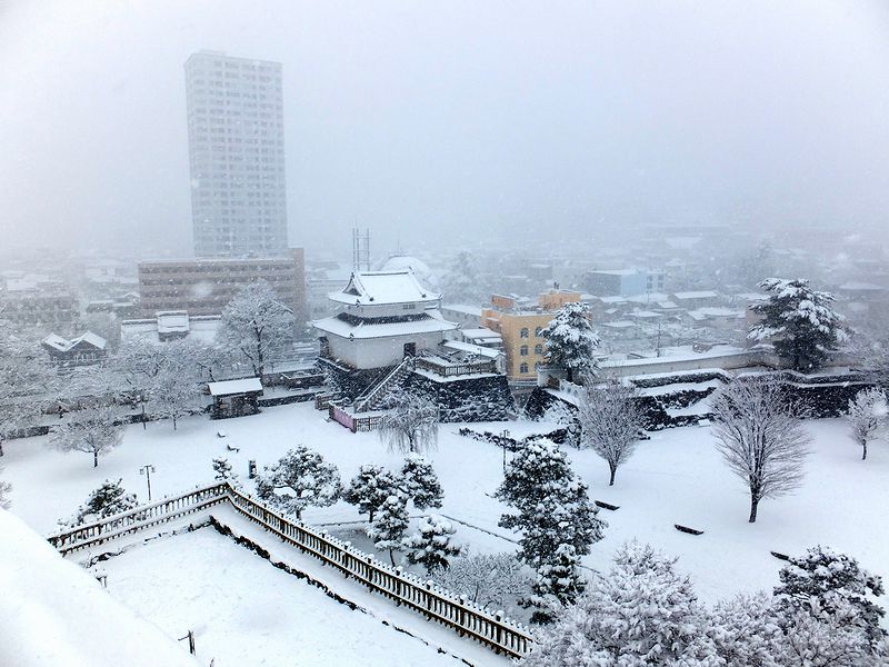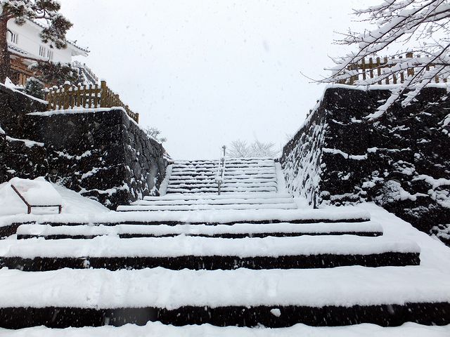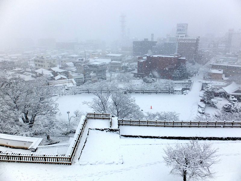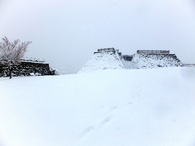 天守台南東角付近。前述のとおり雪のお陰でスケール感がイマイチ実感できず。それにしても、こころなしか降り方が激しくなってきているような…。
