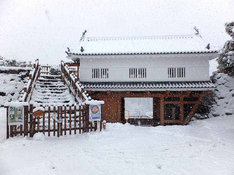 なので最後に、平成16年(2004年)に復元された稲荷櫓を見て辞すことに。内部は公開されていて、石垣などの復元の様子が見られる映像や、発掘された史料などが展示されています。で、この雪の中、お年を召したボランティア?の方が、有り難いことに入口のところの雪かきをされていました。