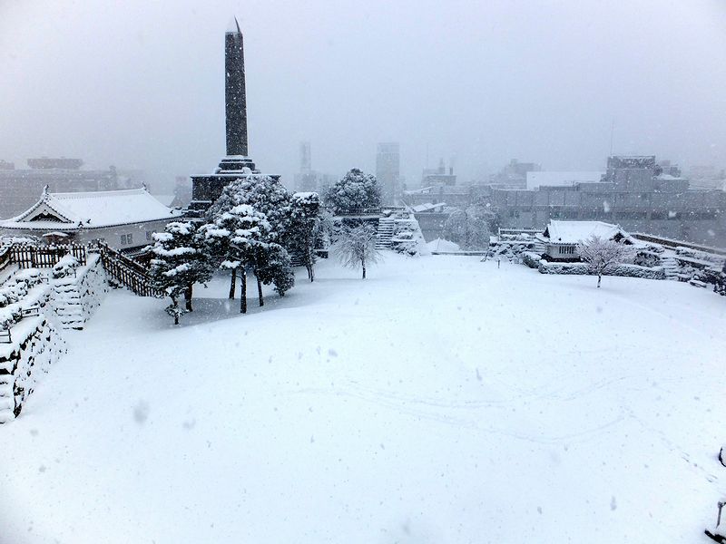 一面の雪でなんだかわからない状況になっていますが、写真奥中央右手が天守台で、左手が天守櫓跡とのこと。ですが、甲府城にいわゆる天守閣が存在したかについては、存在したという明確な証拠がないそうで。