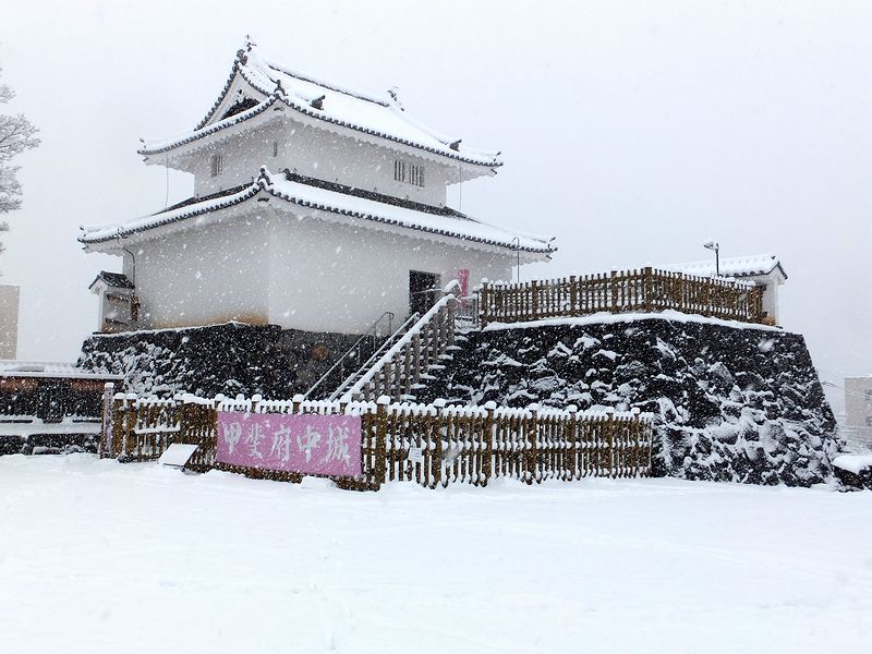 もともとこの日(2月8日)は、雪の予報が出ていたのですが、日帰りでどこか近場のお城に行ってこようと思っていました。それでソチ冬季五輪の開会式を最後まで見た後、いくつかの候補の中から甲府に向かうことに決め、午前5時頃自宅を出発。最寄りのICから東北道に乗り、雪が次第に激しくなる中、北関東道、関越道、外環道、中央道と走って、午前10時前にお城近くの民間駐車場に到着。ところで甲府城というかお城がある舞鶴城公園って、公園の有料駐車場って無いんですかね?
