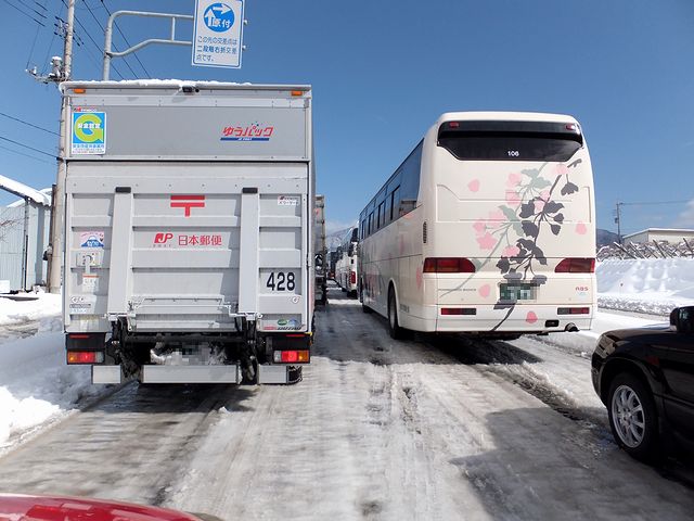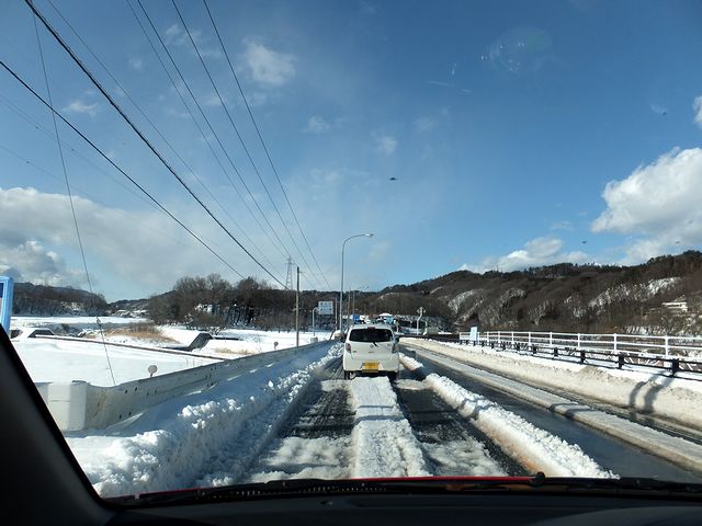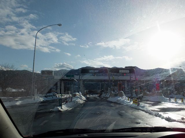 そして翌朝。雪も止み、今度こそ自宅に帰るだけとなったのですが、ネットで見た交通情報によると、相変わらず中央道、国道20号共に通行止めとのこと。とりあえず早い時間に朝食をしっかりいただくもその後はゆっくりしてしまい、結局宿を出発したのは午前9時30分過ぎ。で、まず最初は何も考えずにカーナビ代わりのiPhoneアプリに従っていたのですが、よくよく見てみると昨日途中で諦めた国道140号経由だったので、通行止めにはなっていないけど通れないかもしれないし(実際はそんなことはなかったらしいのですが。)、昨日のハーフスピンの件もあったので、安全性を考慮して進路変更。甲府市内で給油後に、まずは通行止め解除が一番早いと思った中央道を目指し、一宮御坂ICまで行くも、「通行止め解除の見通しは立っていない」とのことで、今度は国道20号へ。それで入って少しは走れたものの、勝沼市に入る手前で完全にストップ。ここで時刻は午前11時前だったのですが、そのまま2時間ほど開通待ちしたところで、ようやく車列が動き出しました。ですが、少し進んだところで前方に作業員さんらしい方がいたのでストップ。その方によれば、「国道20号も中央道も通行止め解除の見通しが立たない」とのこと。(1台1台クルマを停めて説明していました。)。それを聞いて即座にUターンを決意。だいぶ遠回りにはなりますが、諏訪ICまで行けば中央道は通れるようなので、そこから長野道、上信越道経由で帰ることにしました。