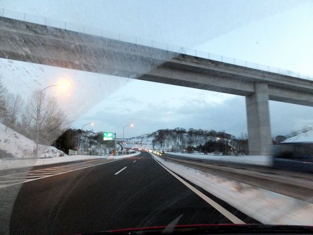 というわけで、ソチオリンピックの開幕式をテレビで見てテンションが上がっていた午前5時過ぎ、自宅アパートを出発。ちなみにこの頃は、降っているものはまだ雪というよりもみぞれという感じで、駐車場のアスファルトはうっすら白くなりつつあるけども、道路に出るとまだビチャビチャという感じでした。それで最寄りのICから東北道に乗り、このところ愛用しているカーナビ代わりのiPhoneアプリの指示どおりに、北関東道から関越道へと歩を進めたというか。で、東北道に入って程なくしてからというか、西に行くにつれ、雪が本格的になってきました。北関東道では50km規制となっていて、所々で除雪作業も行われているような状態。その後関越道に入ると、場所によって雪は小止みになり、速度規制が出ていない箇所もありました(写真の花園ICをちょっと過ぎたところもそう。)が、全体的には降り方にだんだん気合いが入ってきているというか。そんな中、とても早起きした(オリンピックの開会式見ようと、午前1時前には起きていた。)お陰で非常に空腹ということで、この時間に開いていた嵐山PAにピットイン。個人的定番の天玉そばで朝食といたしました。