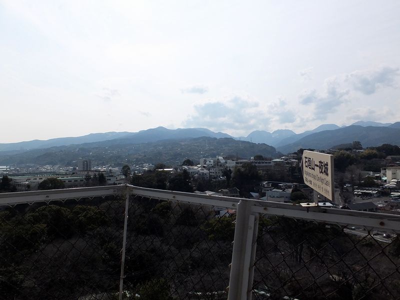 天守から石垣山城を見たところ。秀吉の小田原攻めの際、このような立派な天守があったかはわかりませんが、こちらからだと見上げる感じになるというか、石垣山城からは見下ろされるのを実感。城を秀吉の大群に囲まれ、更にはその本陣である城(しかも、当時、東国では珍しい総石垣造の天守付)を目の当たりにして、北条方の兵はどんな気持ちだったのかなぁ。